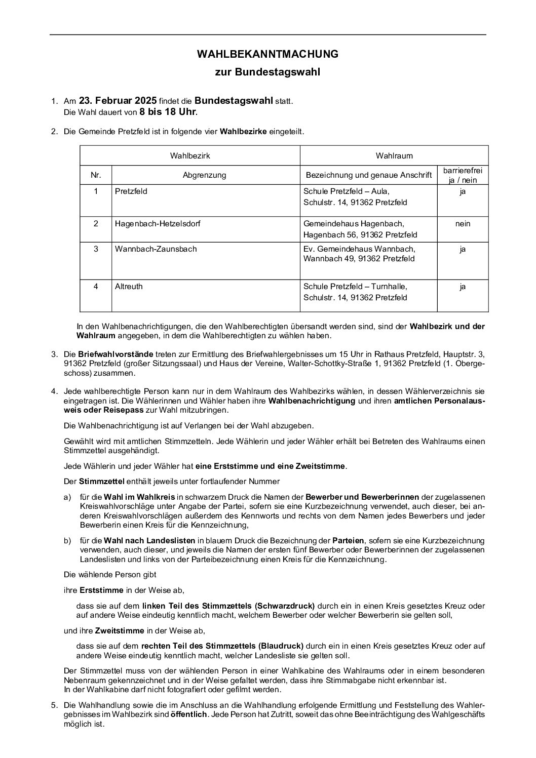 Allgemein Wahlbekanntmachung zur Bundestagswahl von Eva-Maria Alt|Veröffentlicht 13. Januar 2025-Aktualisiert 7. März 2025
