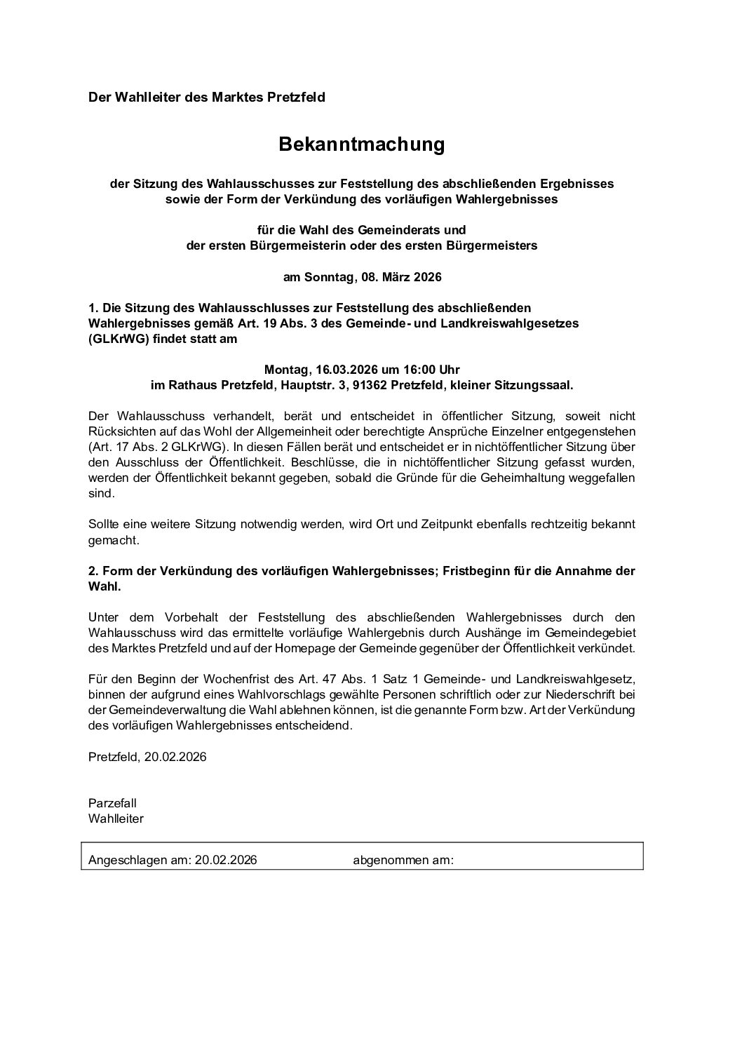 Aktuelles Allgemein Bekanntmachung der Sitzung des Wahlausschusses zur Feststellung des Ergebnisses von Eva-Maria Alt|Veröffentlicht 20. Februar 2026