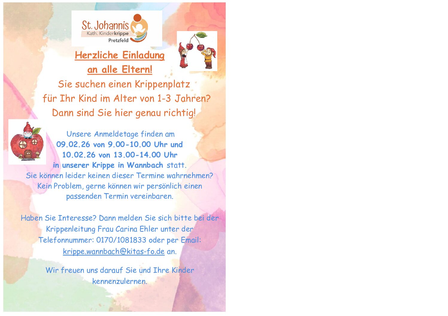 Anmeldetage Kinderkrippe 9:00 – 10:009. Februar 2026 – 10. Februar 2026 iCal Google View full calendar