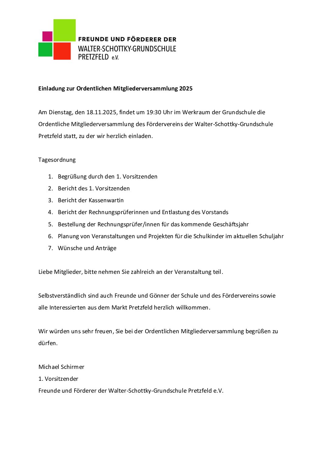 18. November 202519:30: Ordentliche Mitgliederversammlung des Fördervereins der Walter-Schottky-Grundschule Pretzfeld