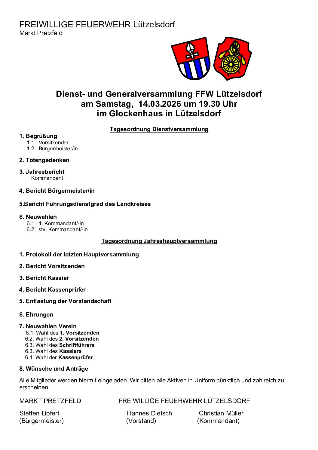 14. März 2026 - Schulanmeldung für das Schuljahr 2026/2027, Verein Zufriedenheit - Jahreshauptversammlung, FSV Pretzfeld - Jahreshauptversammlung, FFW Lützelsdorf - Dienst- und Generalversammlung
